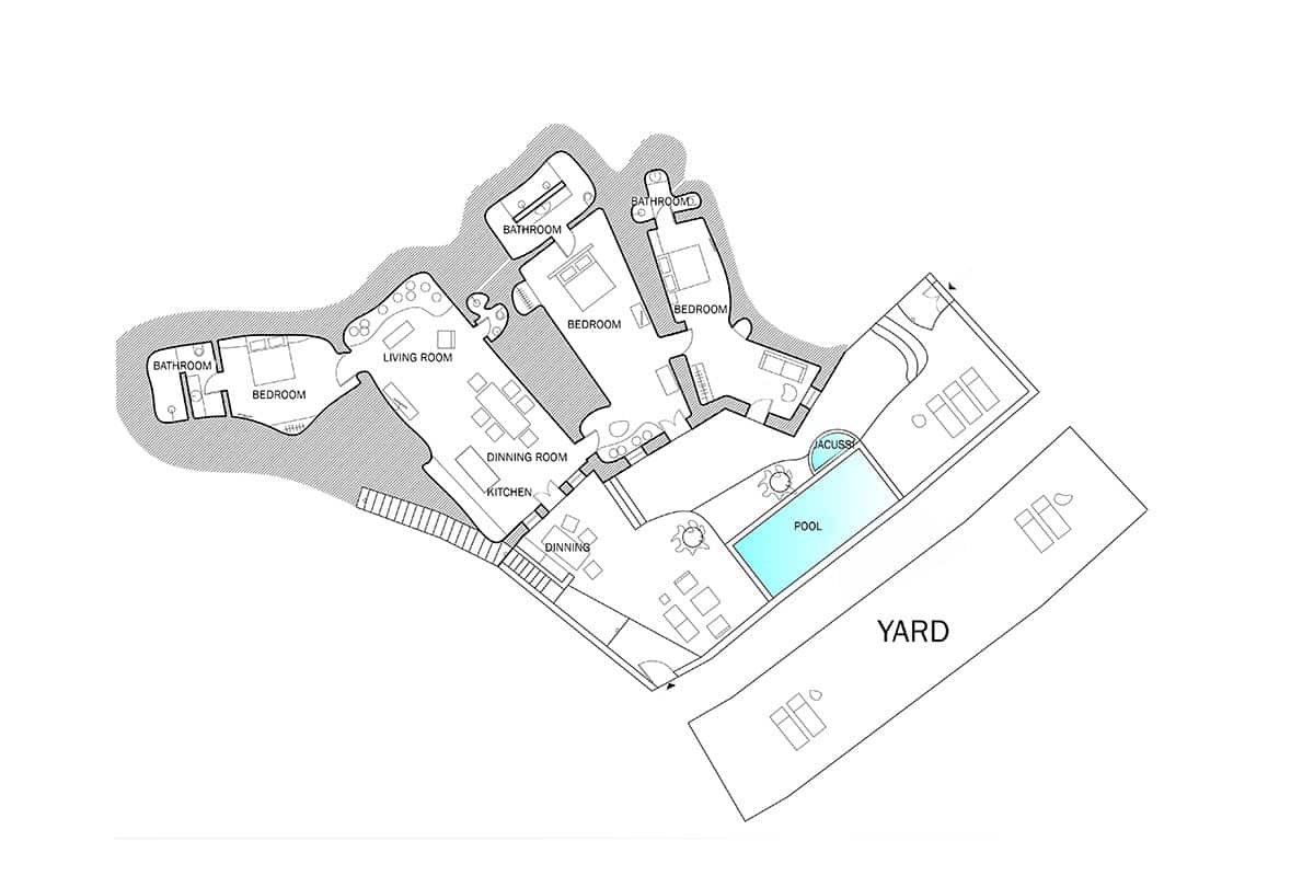 Nestled on the edge of the caldera, this villa is built directly into the hillside, with stunning panoramic views over the famous whitewashed houses perched on the rocks and the mesmerizing blue waters of the Aegean. The villa spans across three interconnected “pods,” designed to integrate seamlessly with the landscape. These pods open up to a spacious pool terrace, offering plenty of room for lounging and entertaining, with additional outdoor areas for relaxation.