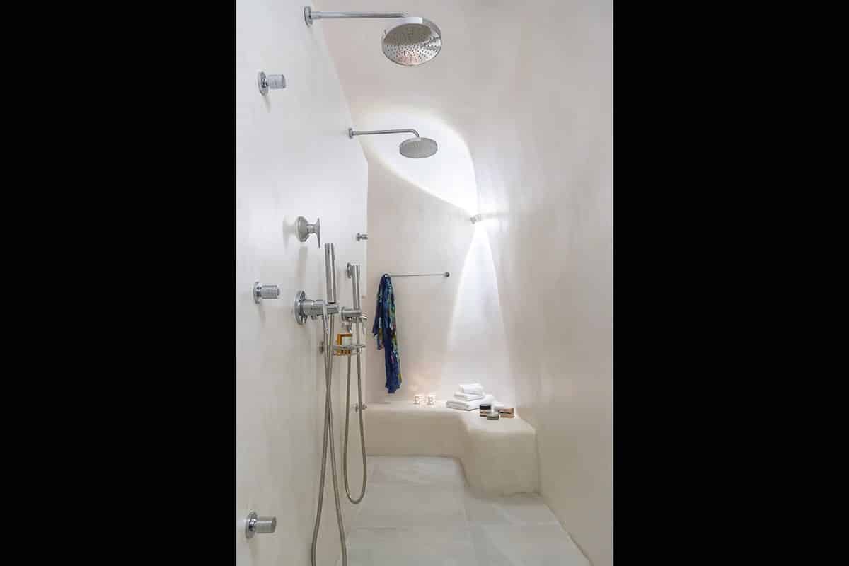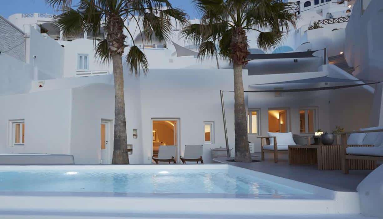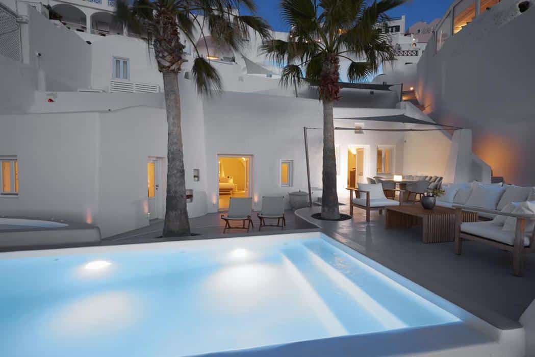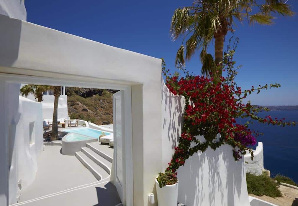 The villa is situated 80 steps below the peak of the caldera, offering a prime location that balances privacy with the beauty of Santorini’s iconic views.